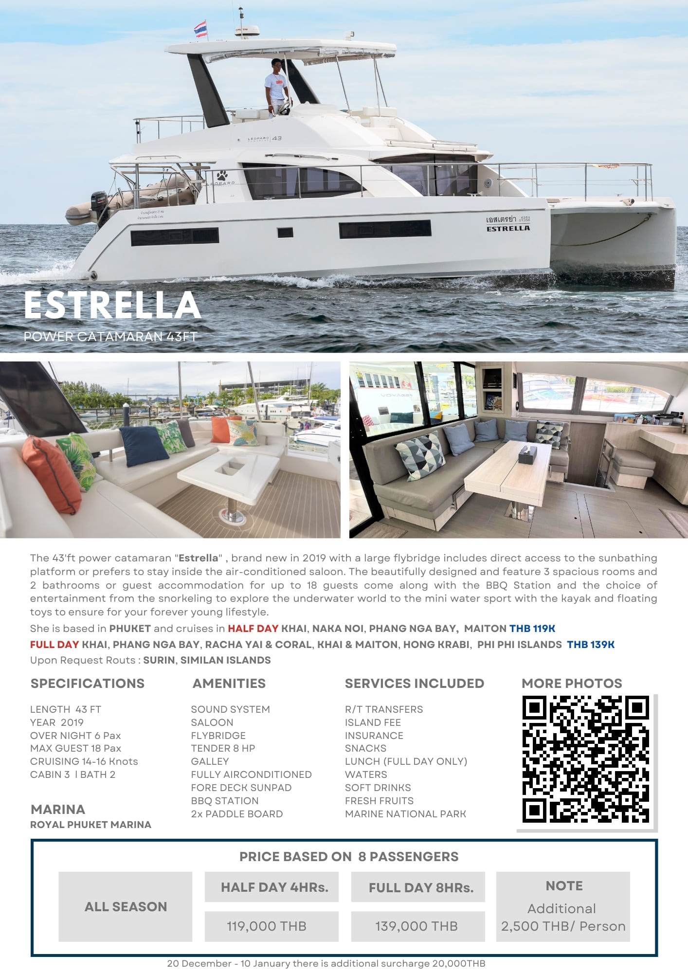 เรือคาตามารันขับเคลื่อนด้วยเครื่องยนต์ขนาด 43 ฟุต “Estrella” เป็นเรือลำใหม่ล่าสุดในปี 2019 มาพร้อมดาดฟ้ากว้างขวาง และห้องนั่งเล่นที่ติดตั้งเครื่องปรับอากาศเพื่อความสะดวกสบายภายในเรือ การออกแบบที่สวยงามของเรือลำนี้ประกอบด้วยห้องพัก 3 ห้อง และห้องน้ำ 2 ห้อง รองรับผู้โดยสารได้สูงสุด 18 คน “Estrella” ยังมีที่สำหรับย่างบาร์บีคิวและตัวเลือกความบันเทิงหลากหลาย เช่น การดำน้ำตื้นเพื่อสำรวจโลกใต้ทะเล คายัค และของเล่นลอยน้ำ เพื่อให้ทุกคนบนเรือได้เพลิดเพลินกับไลฟ์สไตล์ที่สนุกสนานและมีชีวิตชีวา