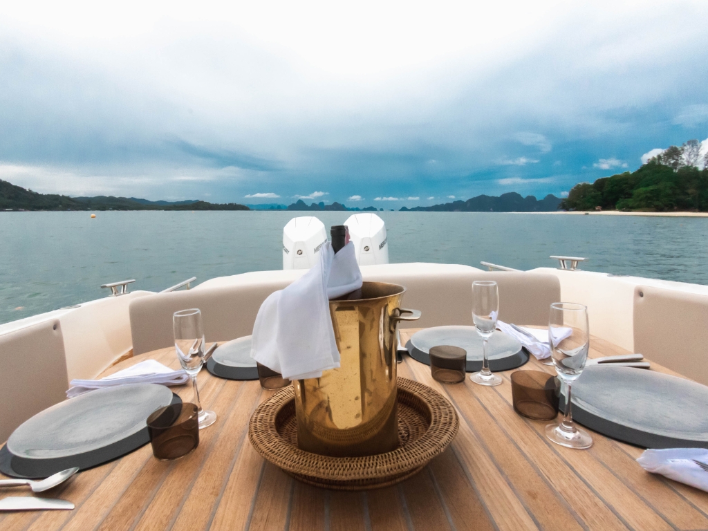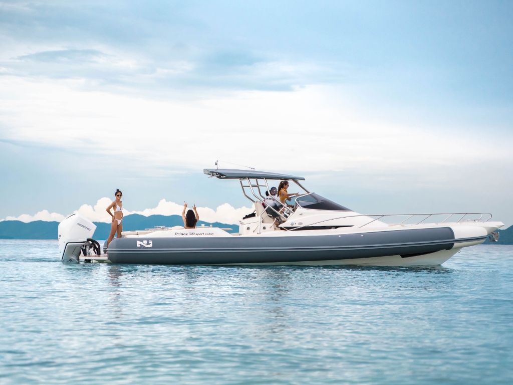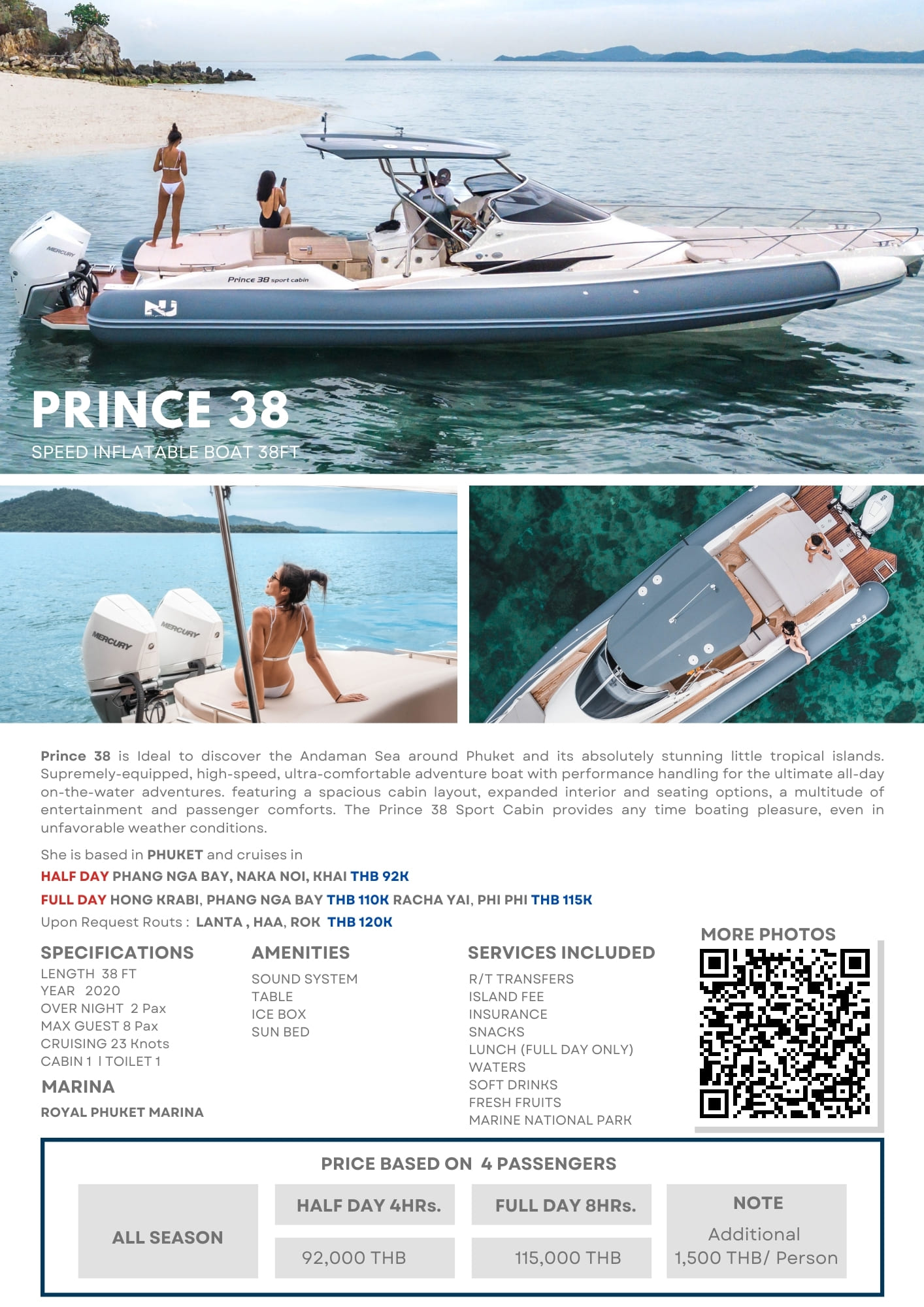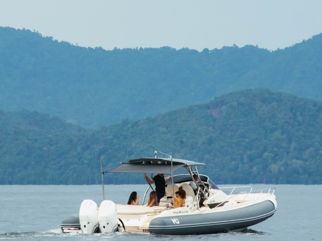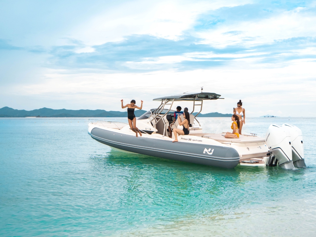 The Prince 38 is ideal for exploring the Andaman Sea around Phuket and its stunning tropical islands. This supremely-equipped, high-speed, ultra-comfortable adventure boat offers performance handling for the ultimate all-day on-the-water adventures. With a spacious cabin layout, expanded interior and seating options, and a multitude of entertainment and passenger comforts, the Prince 38 Sport Cabin ensures boating pleasure at any time, even in unfavorable weather conditions.