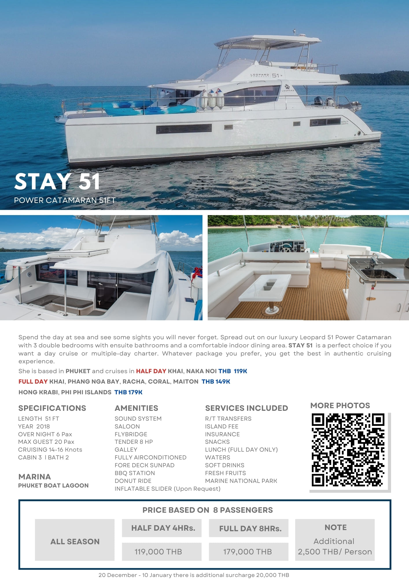 Spend the day at sea and witness unforgettable sights aboard our luxurious Leopard 51 Power Catamaran. With three double bedrooms, each with an ensuite bathroom, and a comfortable indoor dining area, STAY 51 is the perfect choice for a day cruise or a multi-day charter. No matter which package you choose, you will enjoy the best in authentic cruising experiences.